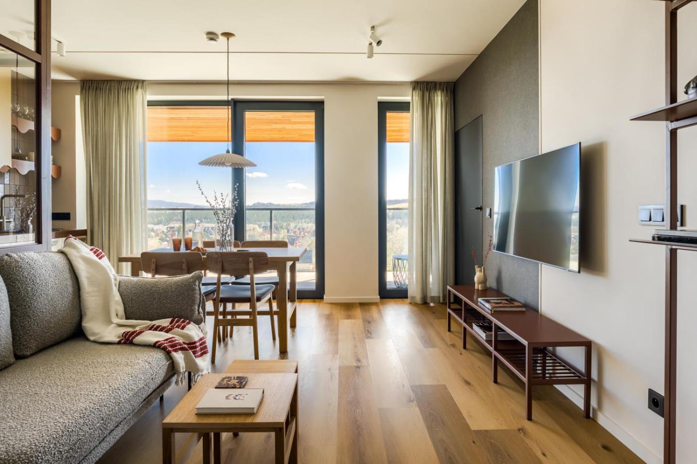 Apartament z 1 sypialnią, balkonem i widokiem na góry. Apartament obejmuje salon, oddzielną sypialnię oraz łazienkę z prysznicem i suszarką do włosów. Posiłki można samodzielnie przygotowywać w kuchni z płytą kuchenną, lodówką, zmywarką do naczyń i przyborami kuchennymi. Pozostałe udogodnienia w tym apartamencie z drewnianą podłogą obejmują część wypoczynkową z telewizorem z płaskim ekranem, pralkę oraz zestaw do parzenia kawy i herbaty. Z okien roztacza się widok na góry. W tej opcji zakwaterowania są dostępne 2 łóżka. Apartament - 5 osobowy. Powierzchnia pokoju ok.: 40 mkw. ;