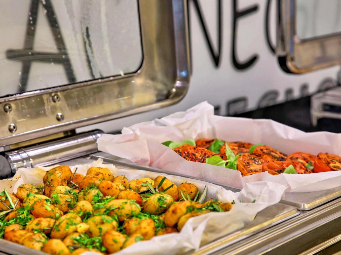 Codziennie rano serwowane jest urozmaicone śniadanie. Na życzenie posiłek ten może zostać dostarczony do pokoju. Restauracja Winestone specjalizuje się w winach oraz daniach podawanych na kamiennych płytach – „les planches”. W hotelu mieści się również nowoczesny bar w holu. Na każdym piętrze zapewniono dozownik z bezpłatną wodą pitną.