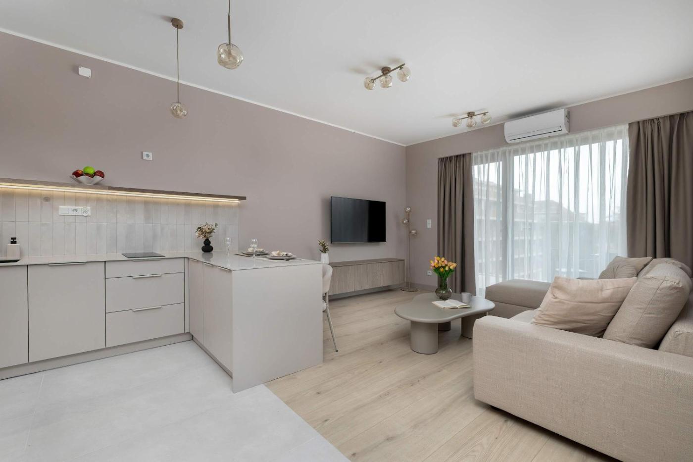 Oferta apartamentu obejmuje sypialnię (1), salon, aneks kuchenny z pełnym wyposażeniem, w tym lodówką i ekspresem do kawy, a także łazienkę (1) z prysznicem oraz bezpłatnym zestawem kosmetyków. W apartamencie zapewniono ręczniki i pościel.